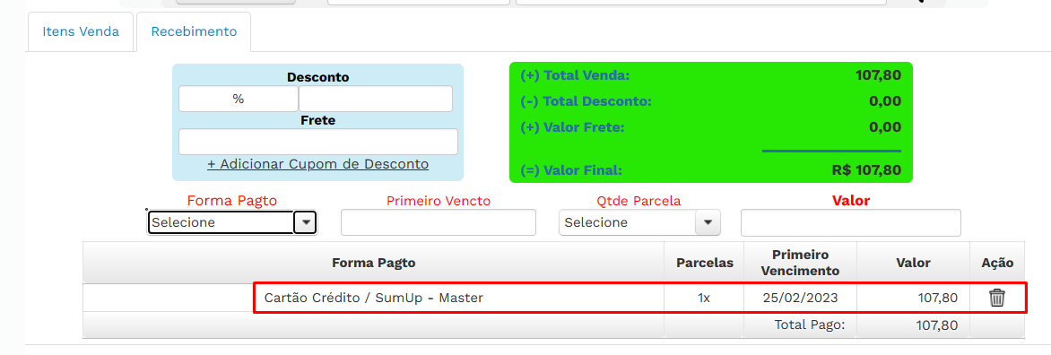 **O total pago sempre precisa bater com o valor final da venda para que você possa finalizar a transação!**