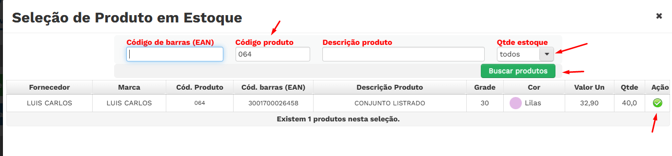 **Se você quiser puxar a mercadoria pelo código de referência (o código menor)**, clique no ícone da lupa > digite o código do produto no respectivo campo > altere o filtro de "**Qtde Estoque**" para **Todos** > depois clique em "Buscar Produtos".&#x20;