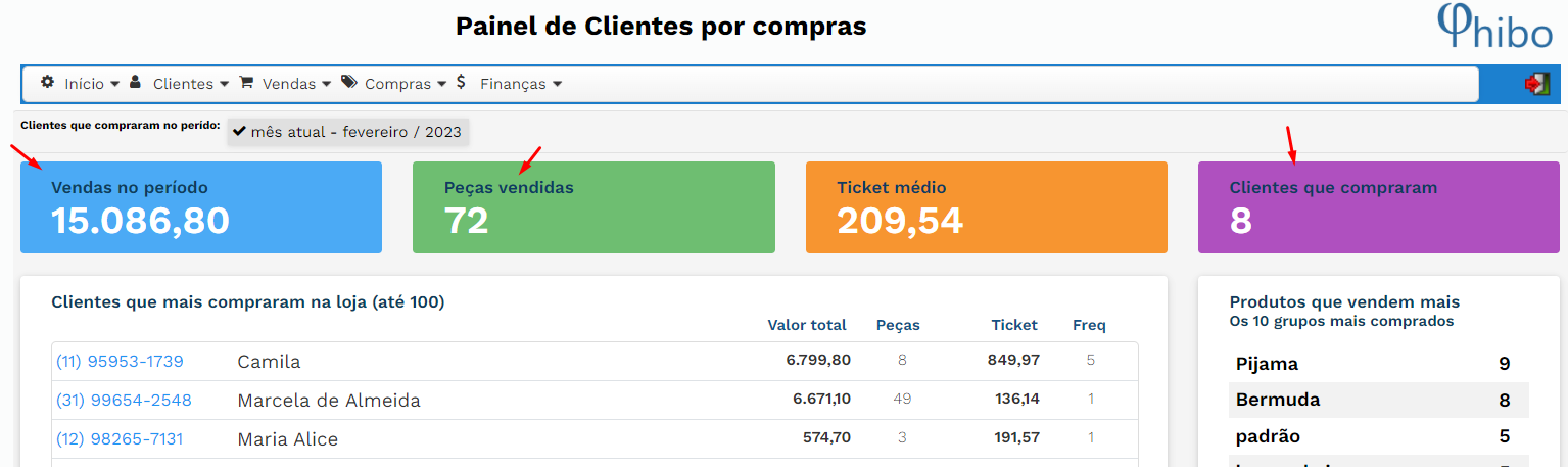 Nesta tela você também consegue visualizar os clientes que mais compraram nesse período (em ordem decrescente, do que mais comprou para o que menos comprou) e também as categorias de produtos mais vendidas.