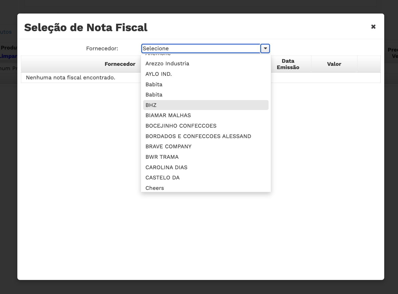 ### Em seguida, busque a nota fiscal desejada, selecionando um FORNECEDOR: